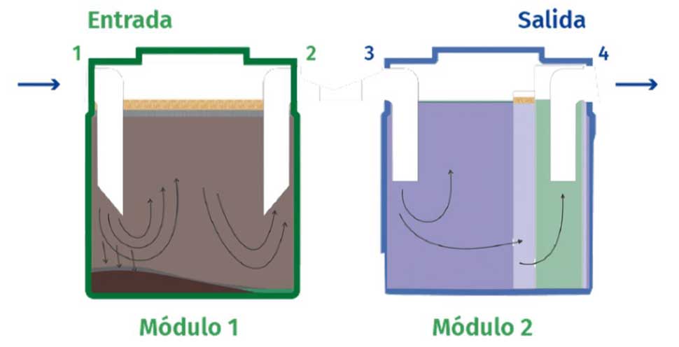 El Biodigestor separa los lodos del agua, mediante la digestión anaerobia el agua es recibida por un filtro anaerobio. Finalmente se produce la salida de agua tratada a un pozo de absorción, zanja de filtración o campo de oxidación.